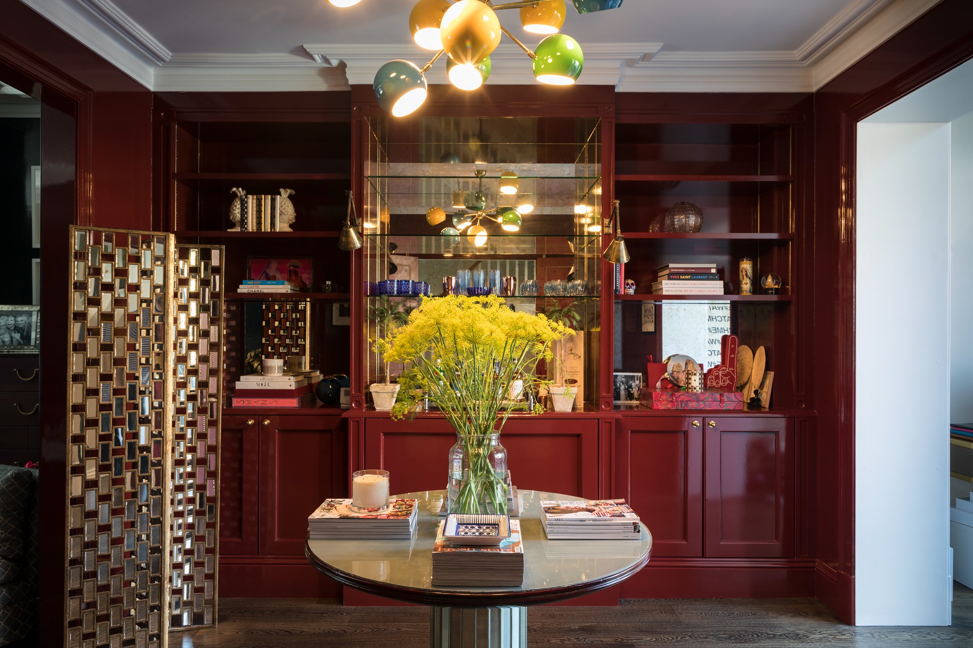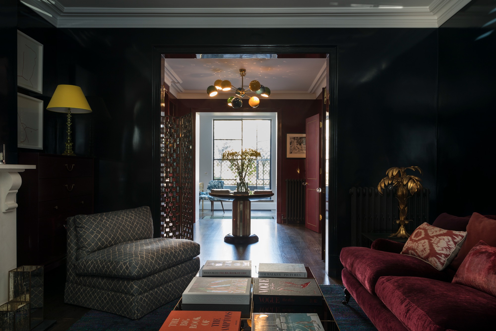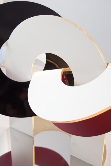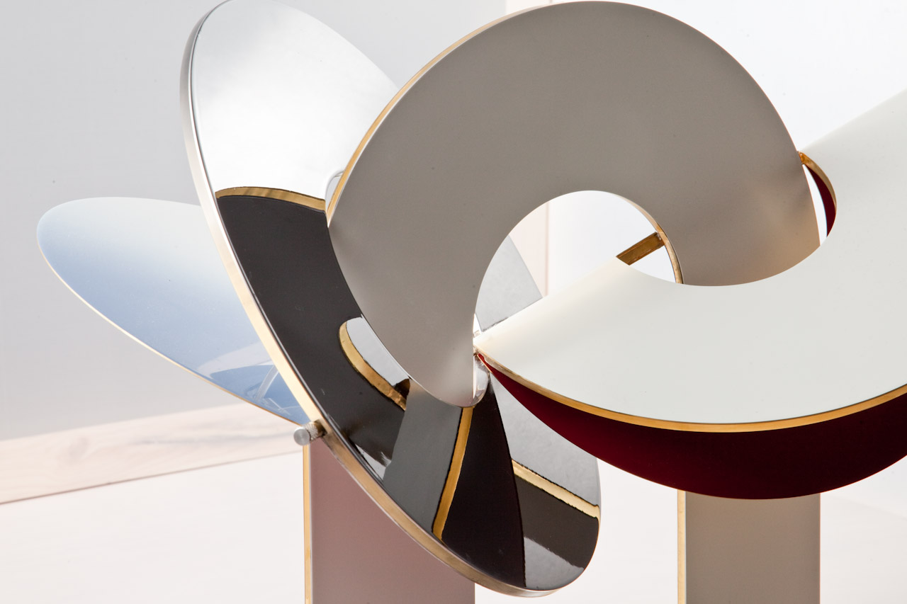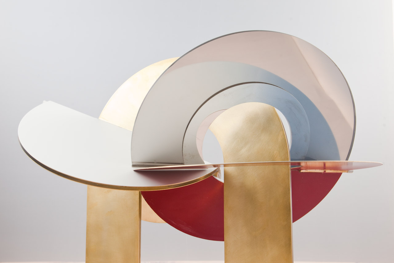 Executed in brass, with custom spun aluminium globes painted in an ultra high gloss finish.
