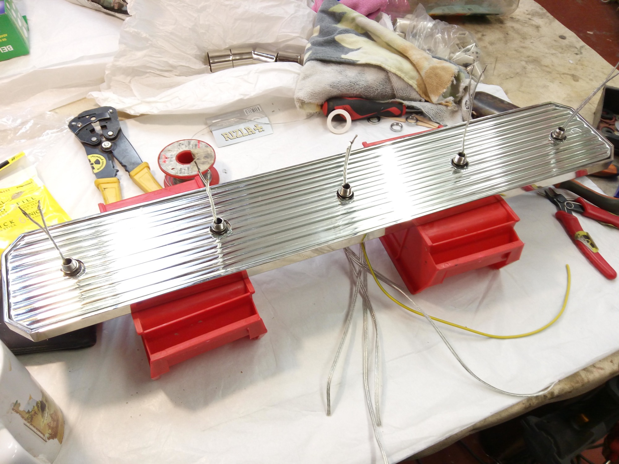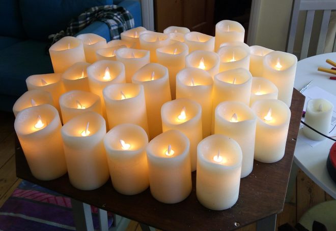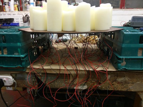 Executed with moving-wick LED candles rewired for mains power, with concealed wiring within the base.