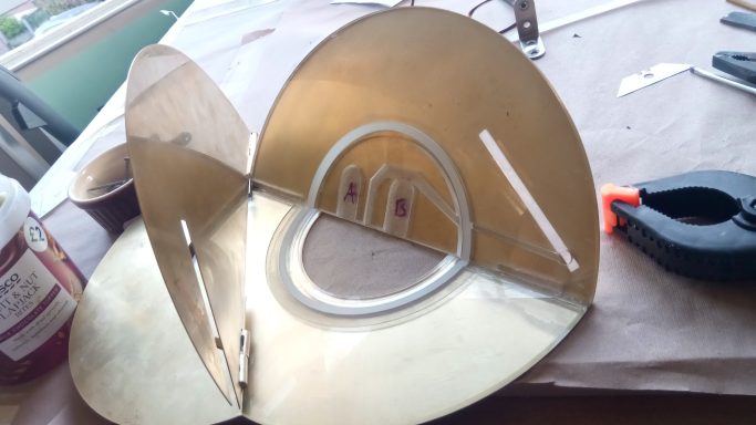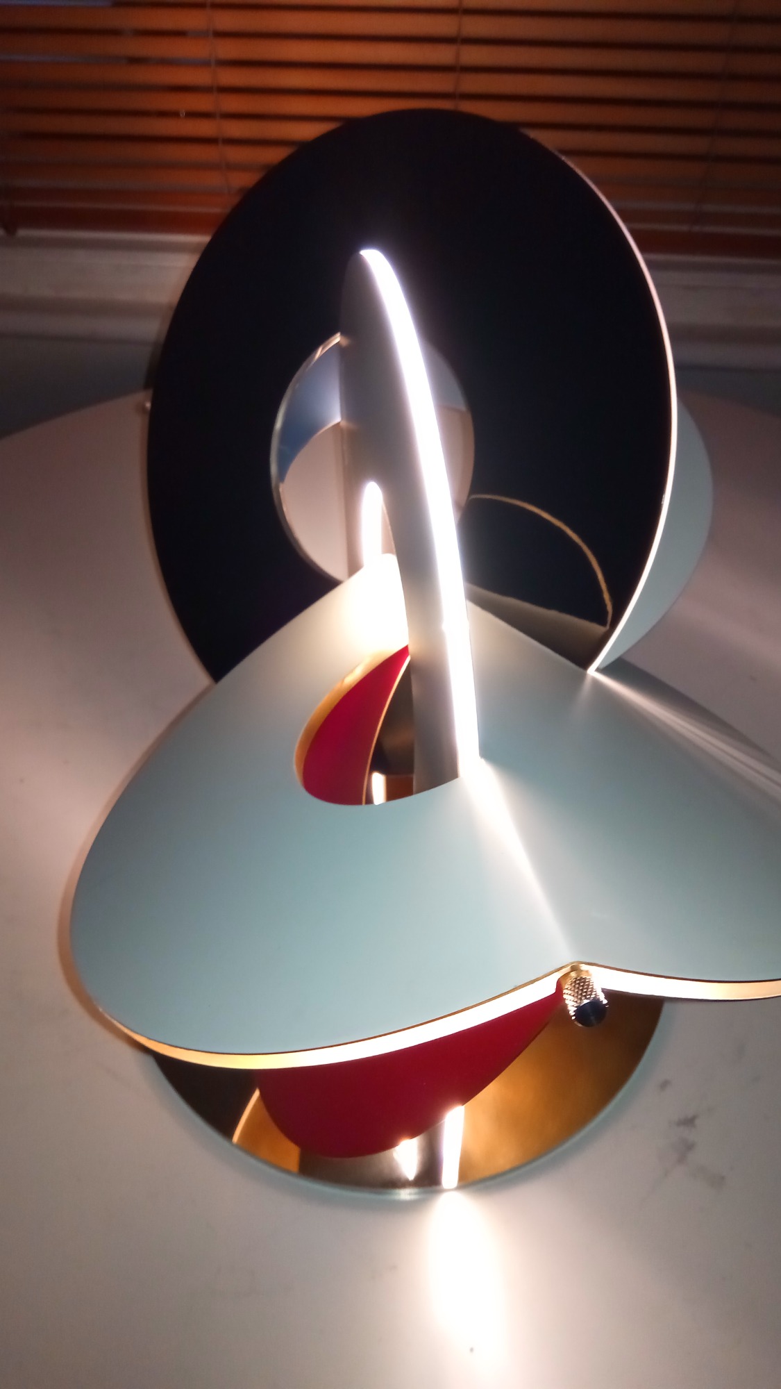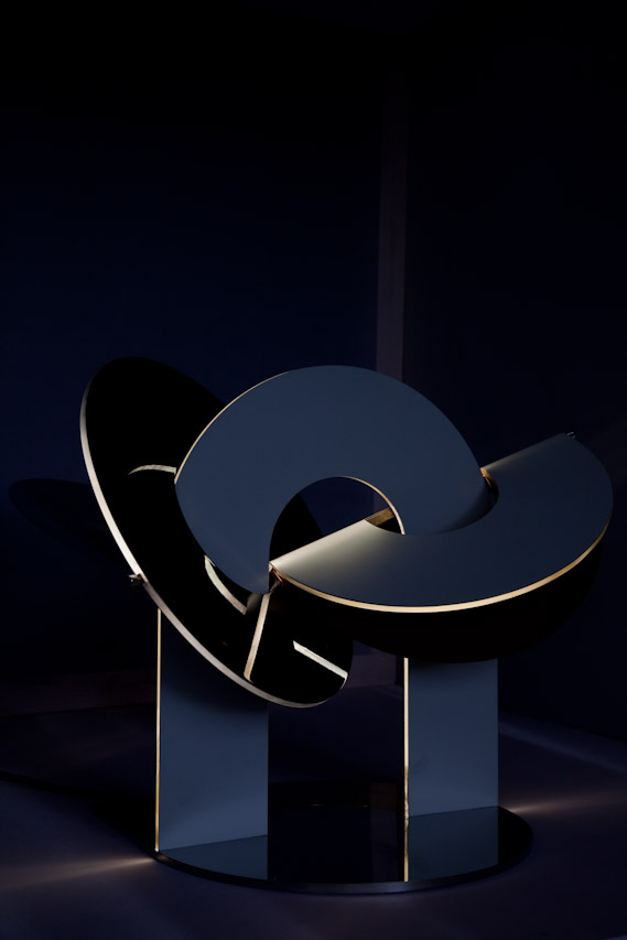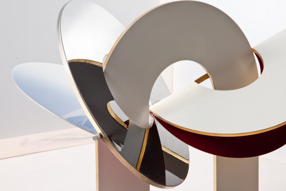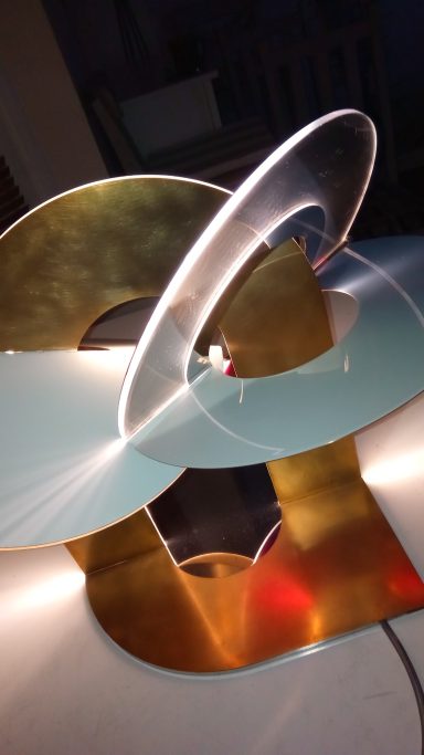 Executed in Perspex, stainless steel and brass, with internal LED illumination and articulated panels.