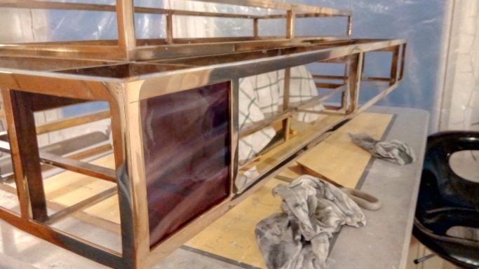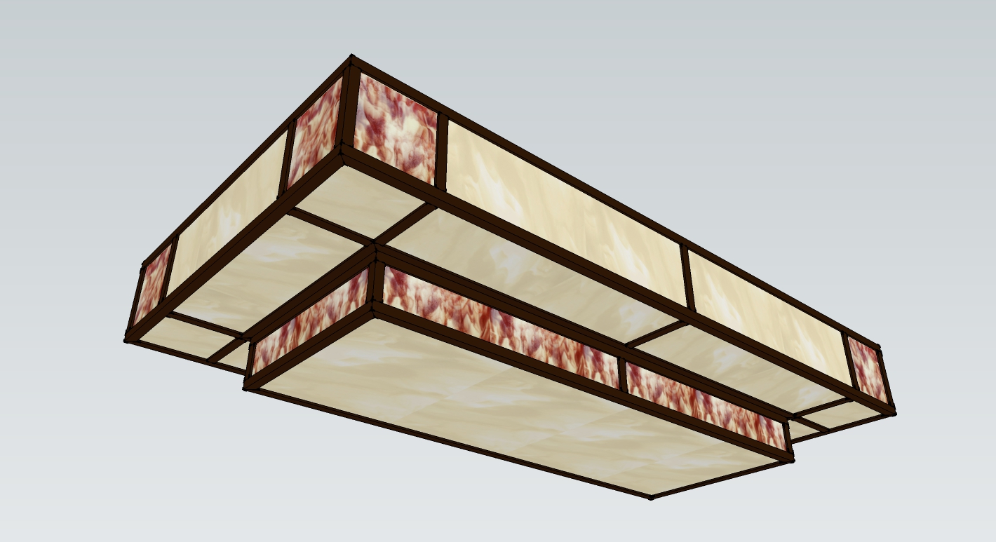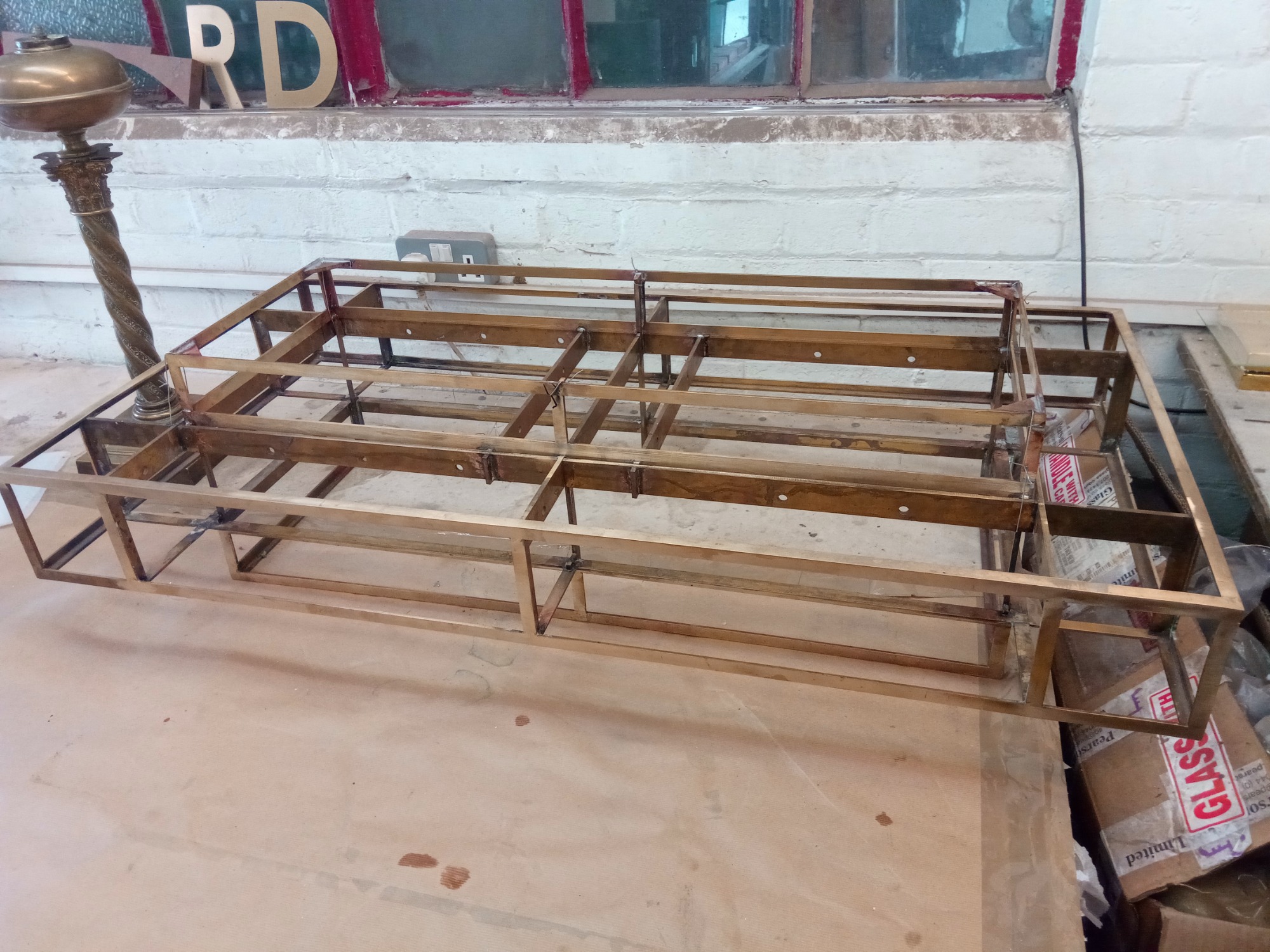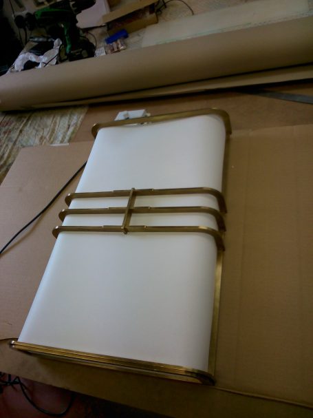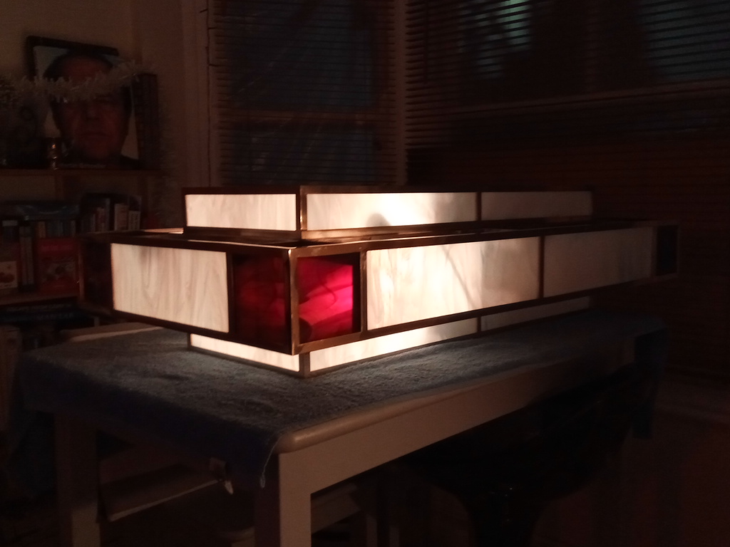Executed in brass, with cathedral glass panes.